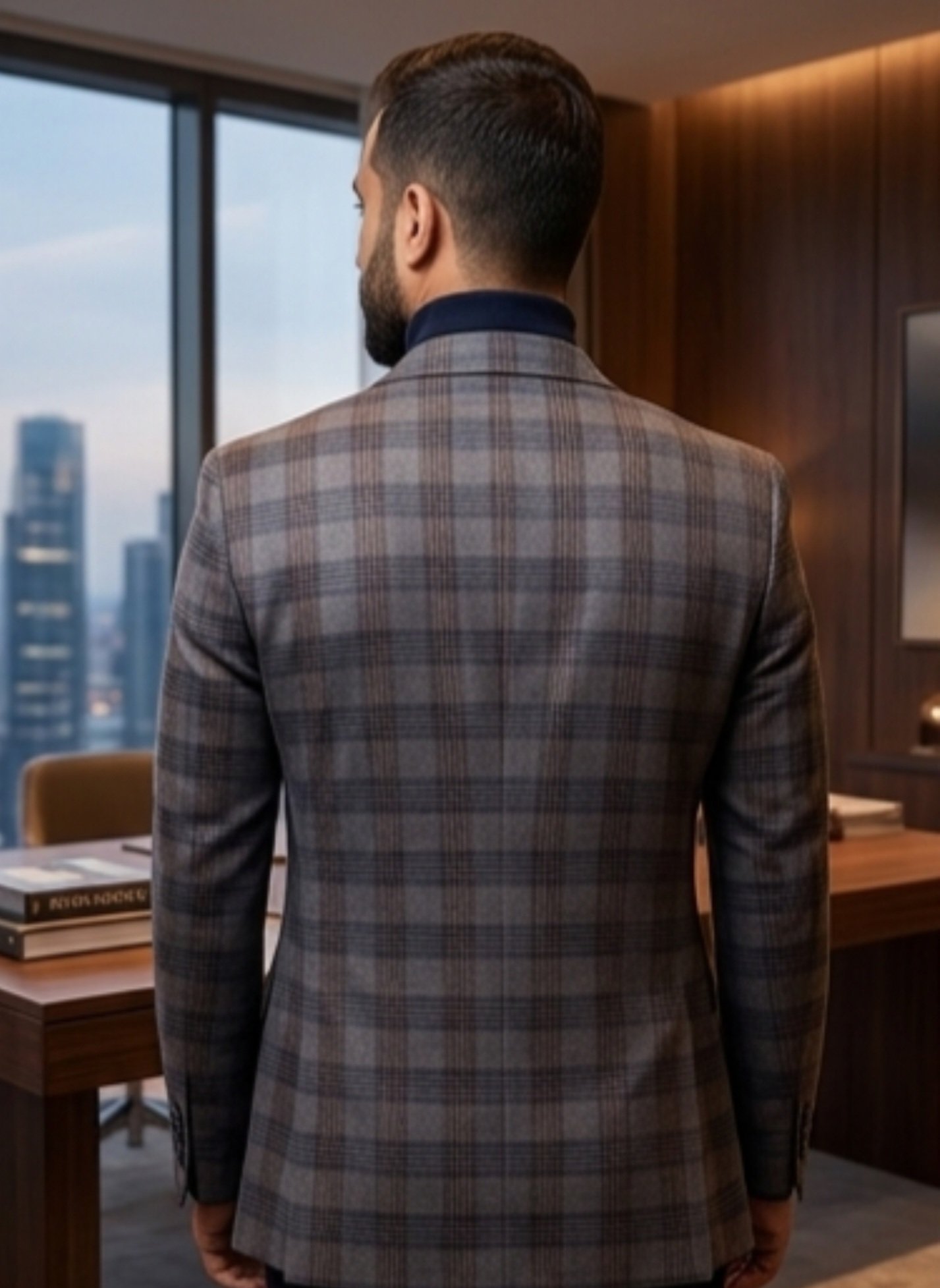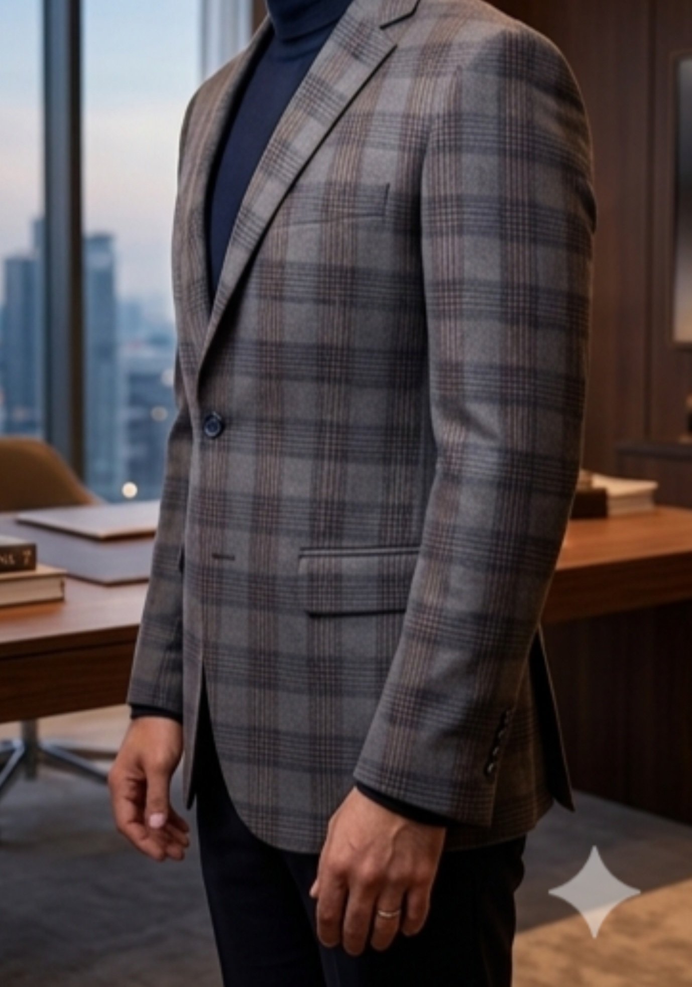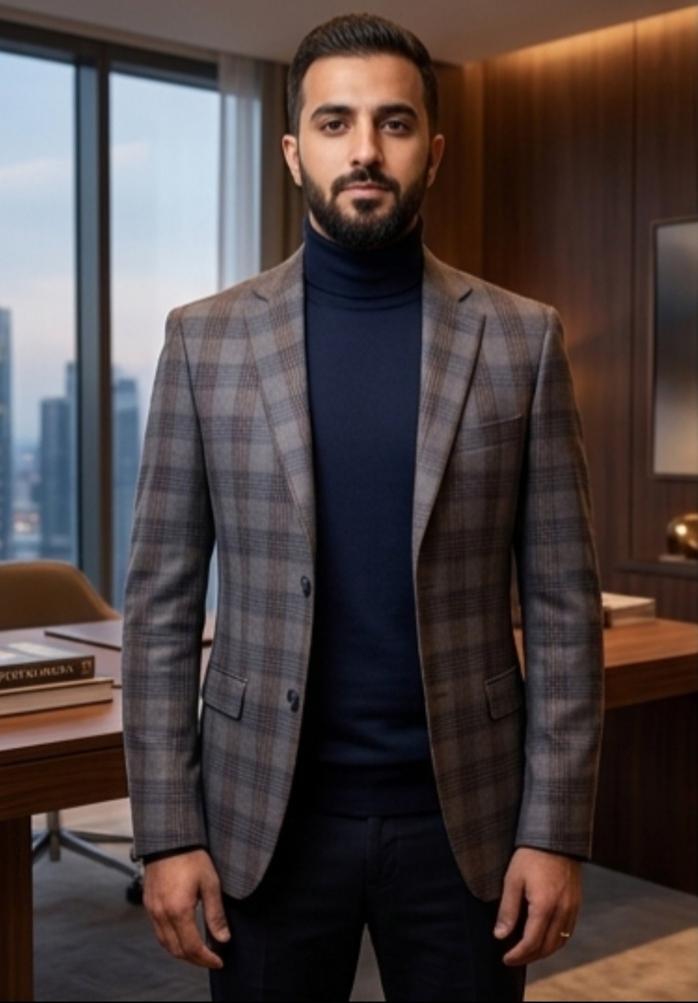 تجسد هذه الإطلالة مزيجًا مثاليًا من الأناقة الكلاسيكية واللمسة العصرية، حيث يرتدي الرجل بليزر بنقشة كاروهات متناسقة بألوان رمادية دافئة تضيف عمقًا بصريًا وجاذبية راقية. تم تنسيق البليزر مع قميص بياقة عالية (تيرتل نِك) بلون داكن، ما يمنح الإطلالة طابعًا أنيقًا ومريحًا في الوقت ذاته. يظهر التصميم بخطوط نظيفة وقصة متقنة تبرز القوام بشكل جذاب دون مبالغة. الخلفية المكتبية الفخمة، مع الإضاءة الدافئة والخشب المصقول، تعزز الإحساس بالفخامة والرقي، مما يجعل هذه الإطلالة مثالية للاجتماعات الرسمية أو المناسبات الراقية التي تتطلب حضورًا مميزًا وواثقًا.