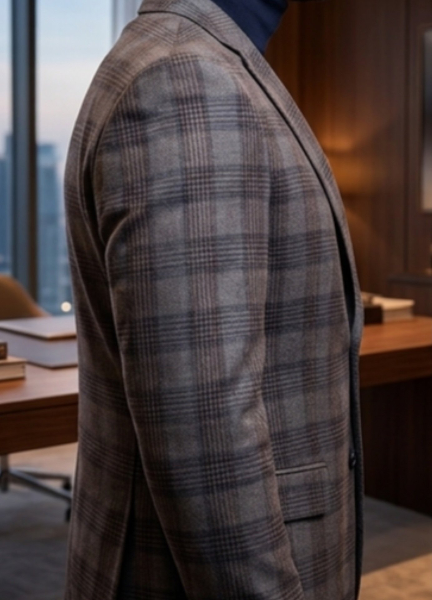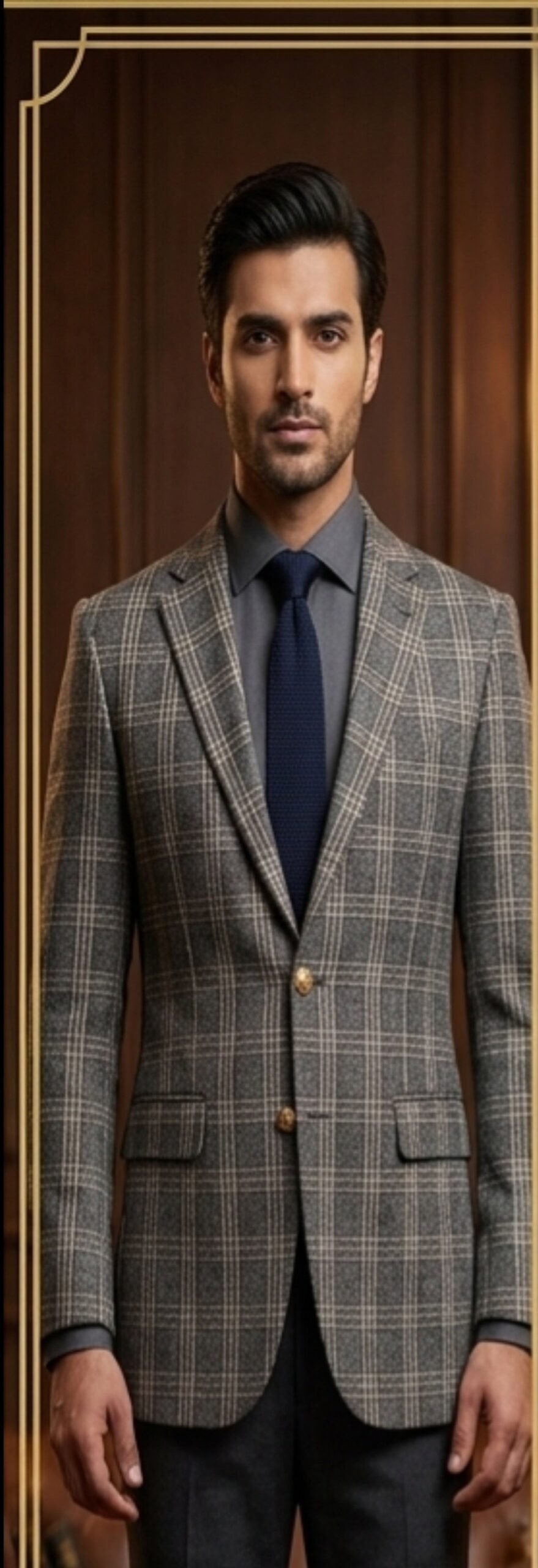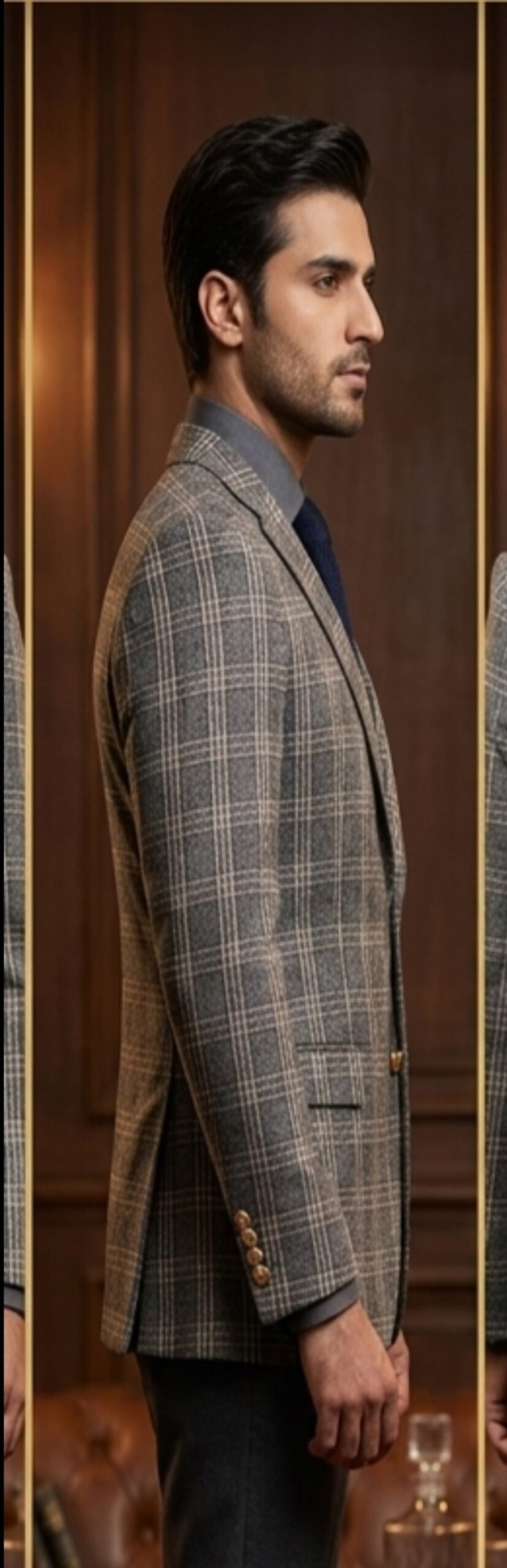 تجسد هذه الإطلالة مزيجًا مثاليًا من الأناقة الكلاسيكية واللمسة العصرية، حيث يرتدي الرجل بليزر بنقشة كاروهات متناسقة بألوان رمادية دافئة تضيف عمقًا بصريًا وجاذبية راقية. تم تنسيق البليزر مع قميص بياقة عالية (تيرتل نِك) بلون داكن، ما يمنح الإطلالة طابعًا أنيقًا ومريحًا في الوقت ذاته. يظهر التصميم بخطوط نظيفة وقصة متقنة تبرز القوام بشكل جذاب دون مبالغة. الخلفية المكتبية الفخمة، مع الإضاءة الدافئة والخشب المصقول، تعزز الإحساس بالفخامة والرقي، مما يجعل هذه الإطلالة مثالية للاجتماعات الرسمية أو المناسبات الراقية التي تتطلب حضورًا مميزًا وواثقًا.