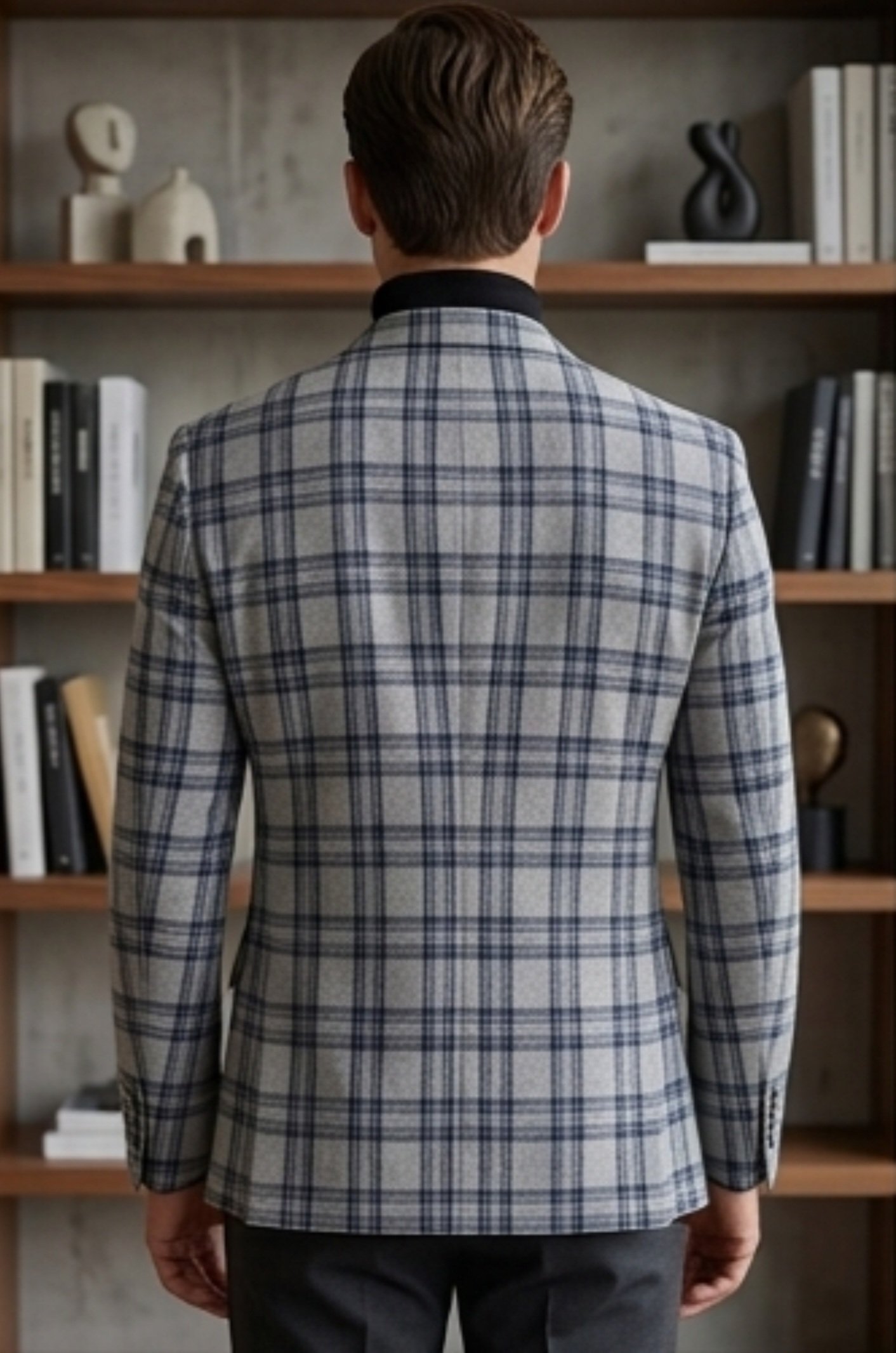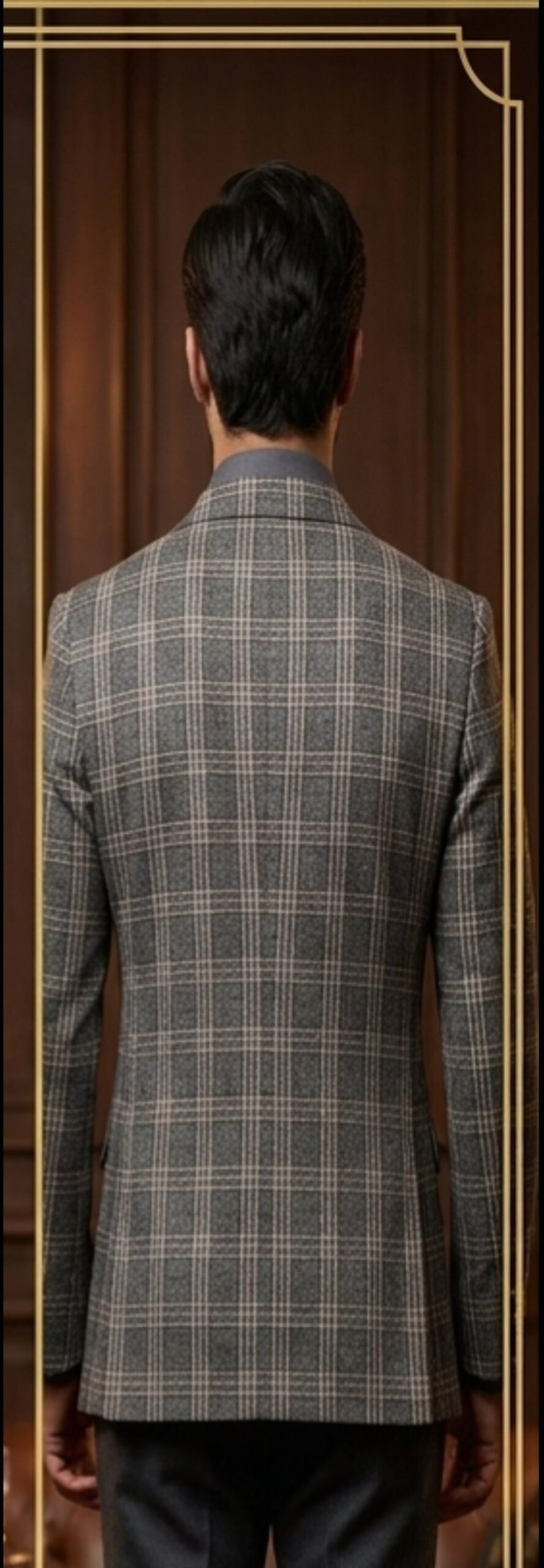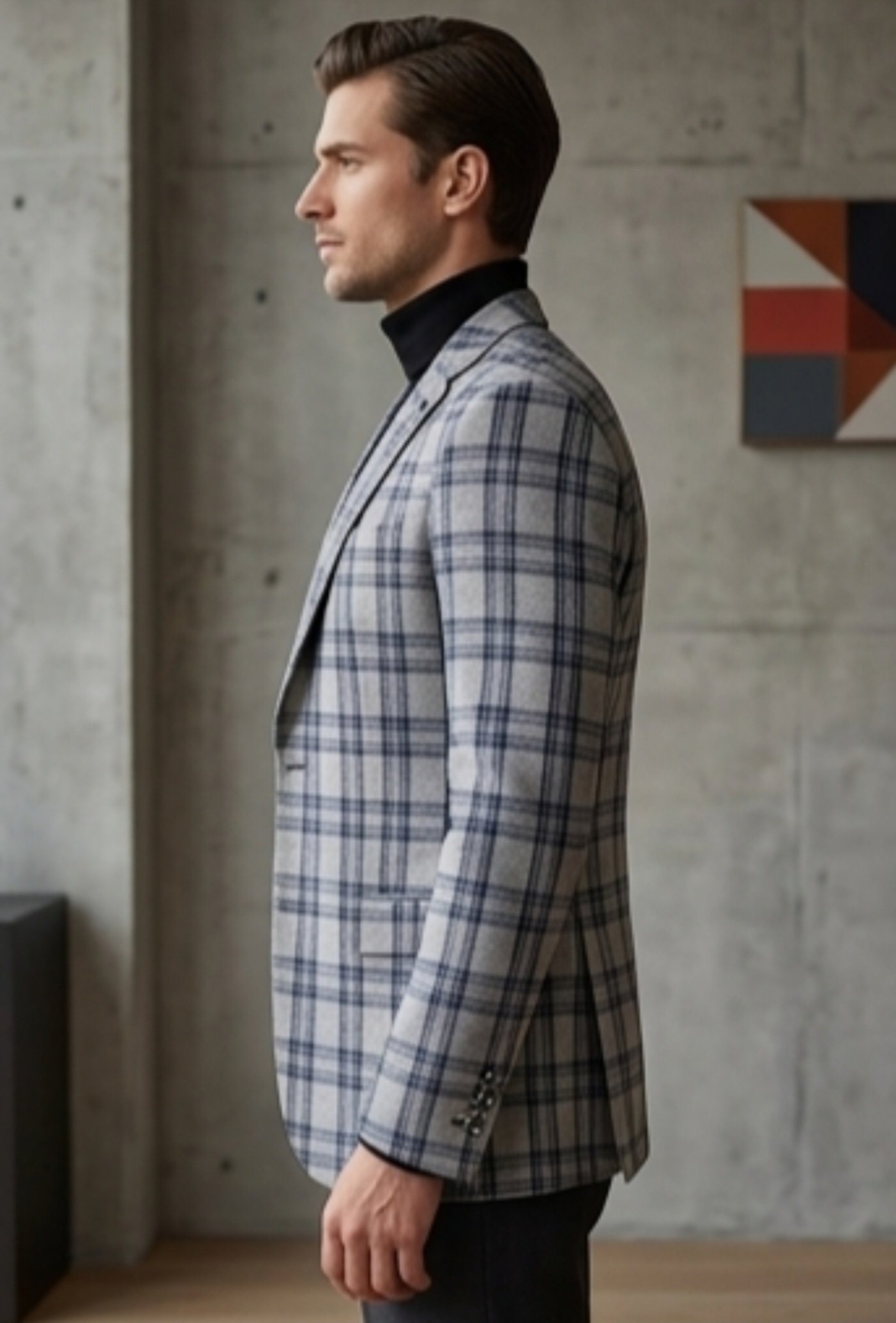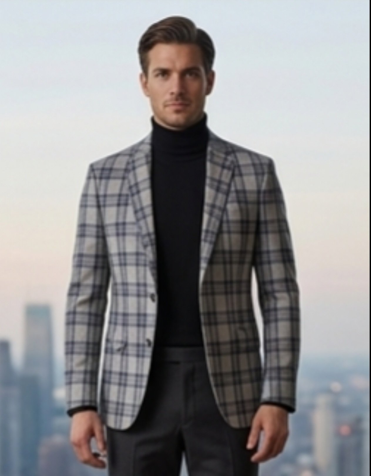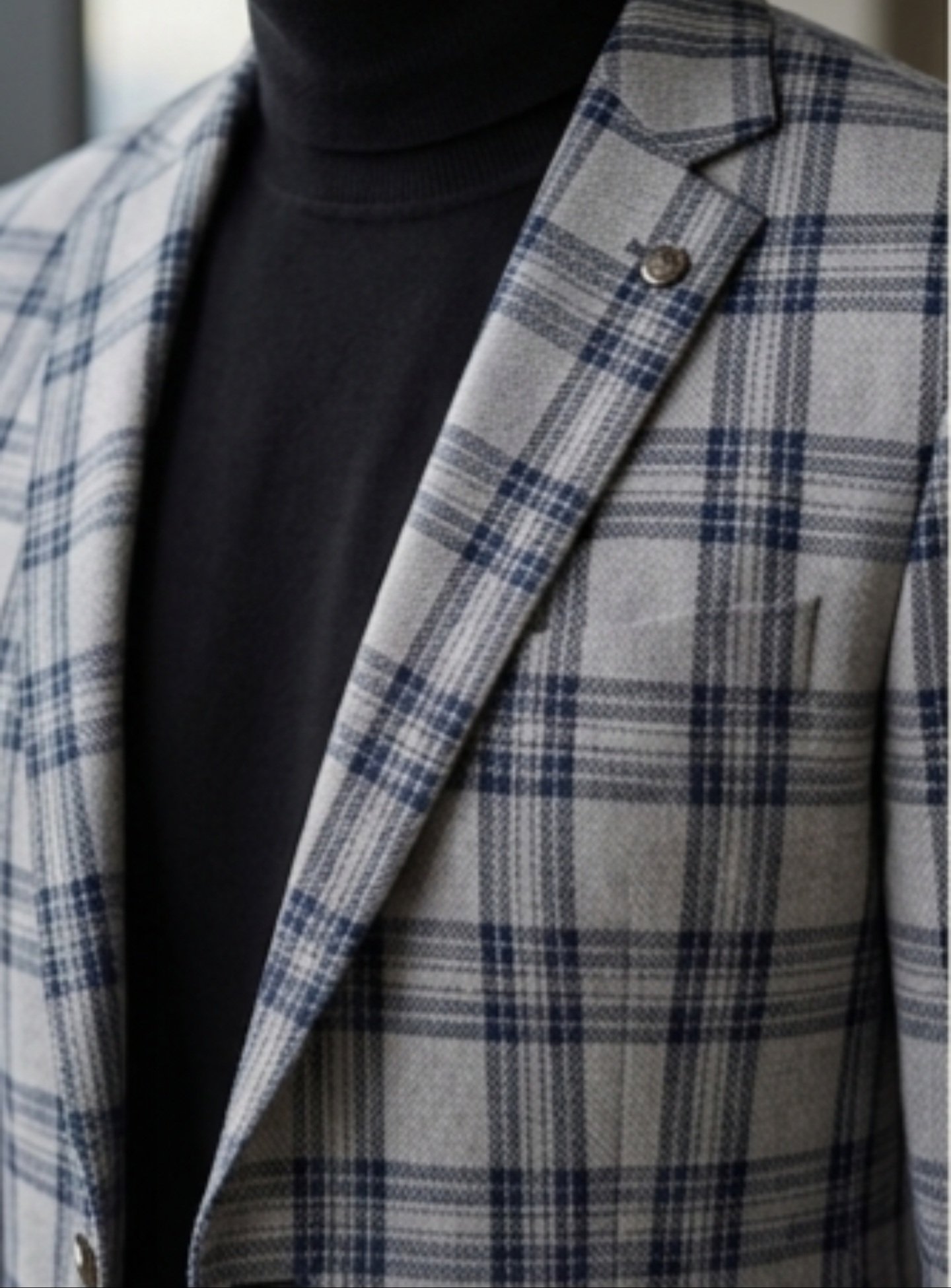 إطلالة رجالية أنيقة تجمع بين بليزر كاروهات بدرجات رمادية وقميص بياقة عالية داكنة، تعكس أسلوبًا عصريًا راقيًا.