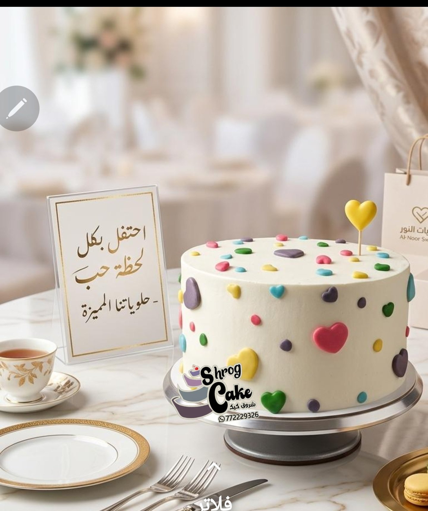 شكلها بيحكي حكايتها طريه وهشة ولذيذه لذااذه بشهادة الزبونه داخلها 6حشواتبمقاس 15 مررتفع مملسة.بكريمة بلونها اللبني الجذاب وعليها قلوب بانوان زهريه جذابه من عجينة اليكر شكل خلاب معا نحتفل بحب حلوياتنا المميزة احجز طلبك الان للرقم772229326 ملاحظة هناك مقاسات مختلفه باسعار منافسه