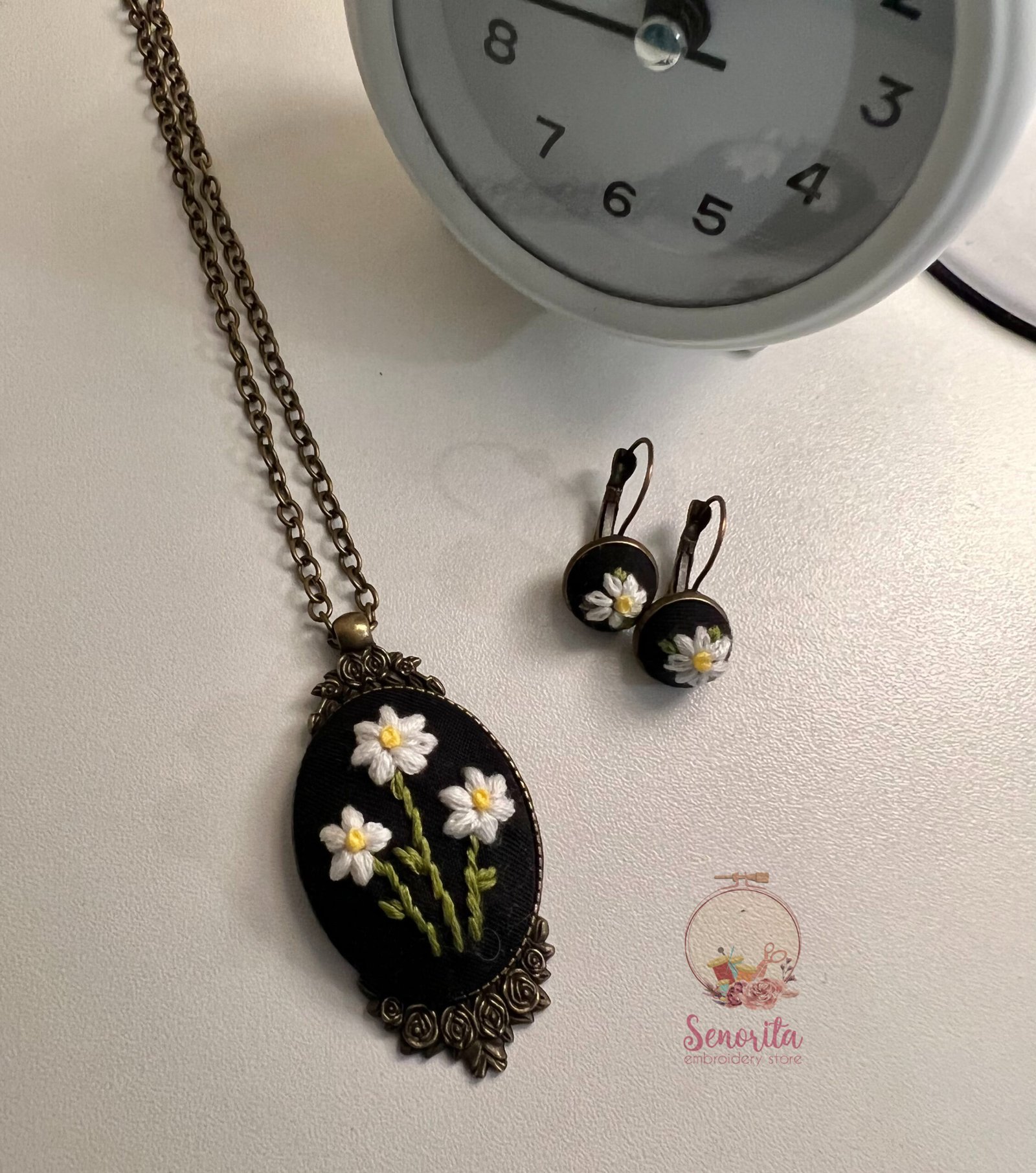 تطريز طقم مكون من سلسال وحلق بوردة البابونج.