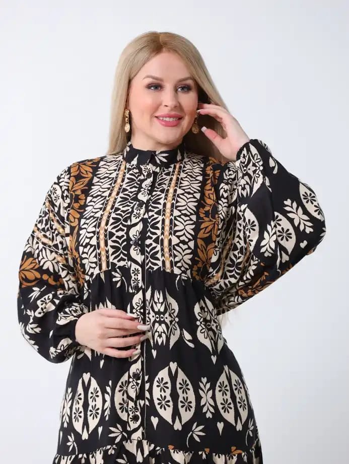 تونيك نسائي بتصميم مميز يجمع بين الأناقة والراحة في قطعة واحدة مناسبة للإطلالات اليومية والراقية. يأتي باللون الأسود مع طبعات نباتية وزخارف متناغمة بدرجات البيج والبني، ما يمنحه طابعًا أنثويًا أنيقًا ولمسة كلاسيكية جذابة. كما يتميز بأكمام طويلة وقصة مريحة تساعد على سهولة الحركة وتمنح مظهرًا مرتبًا وأنيقًا في الوقت نفسه.