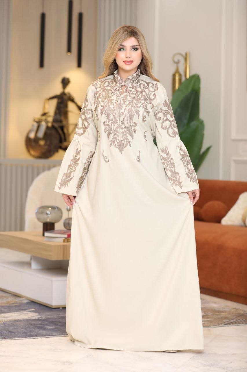 جلابية نسائية راقية بتصميم طويل وانسيابي يجمع بين الفخامة والنعومة في قطعة واحدة مميزة. تأتي بلون أوف وايت هادئ يمنح الإطلالة طابعًا أنثويًا أنيقًا وراقيًا، مع تطريز بيج فاخر يزين الصدر والياقة والأكمام بنقوش زخرفية متناسقة تضيف حضورًا لافتًا ولمسة فخامة واضحة. كما أن القصة الواسعة والمريحة تمنح سهولة في الحركة ومظهرًا محتشمًا ومرتبًا يناسب مختلف الأوقات الراقية.