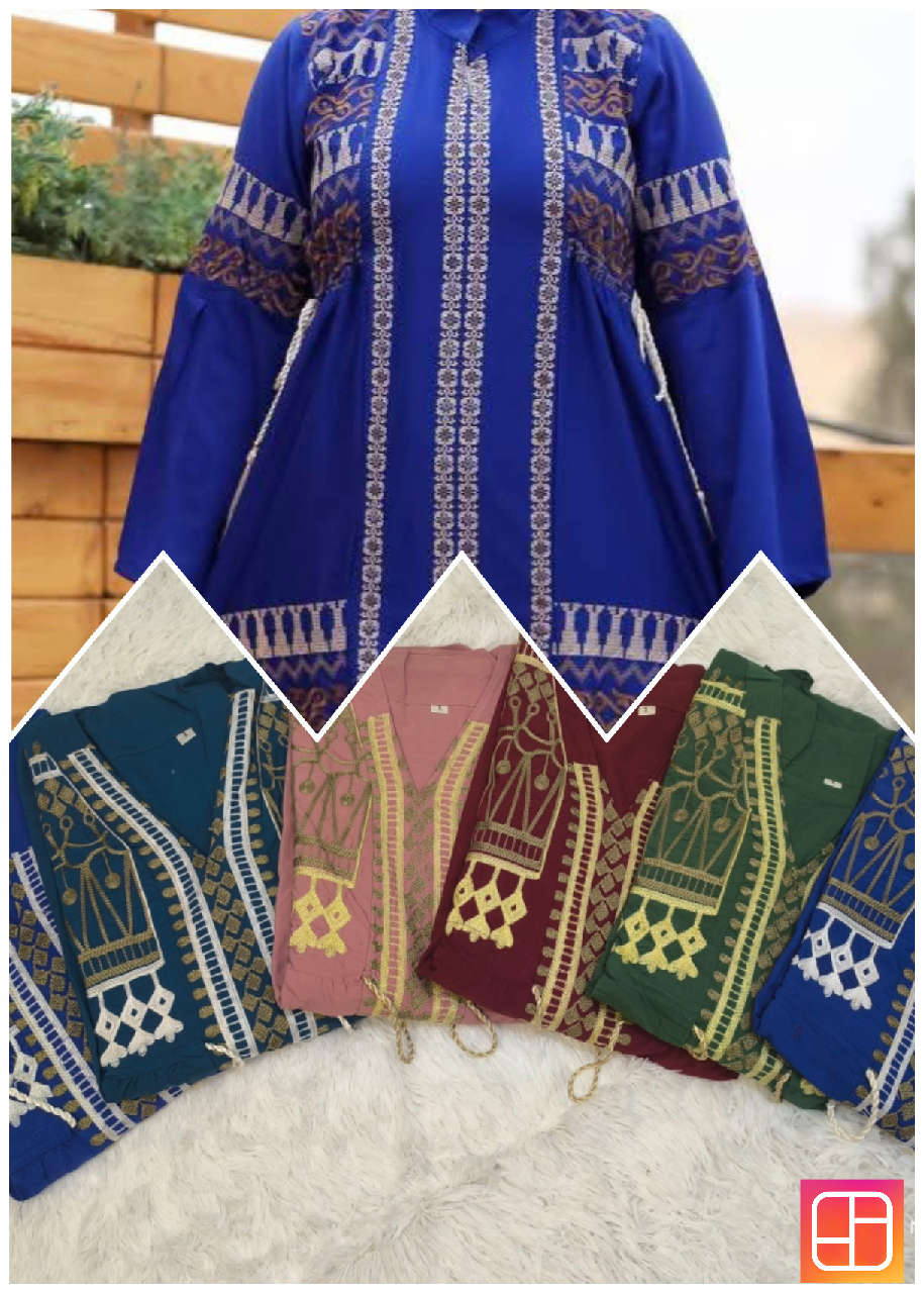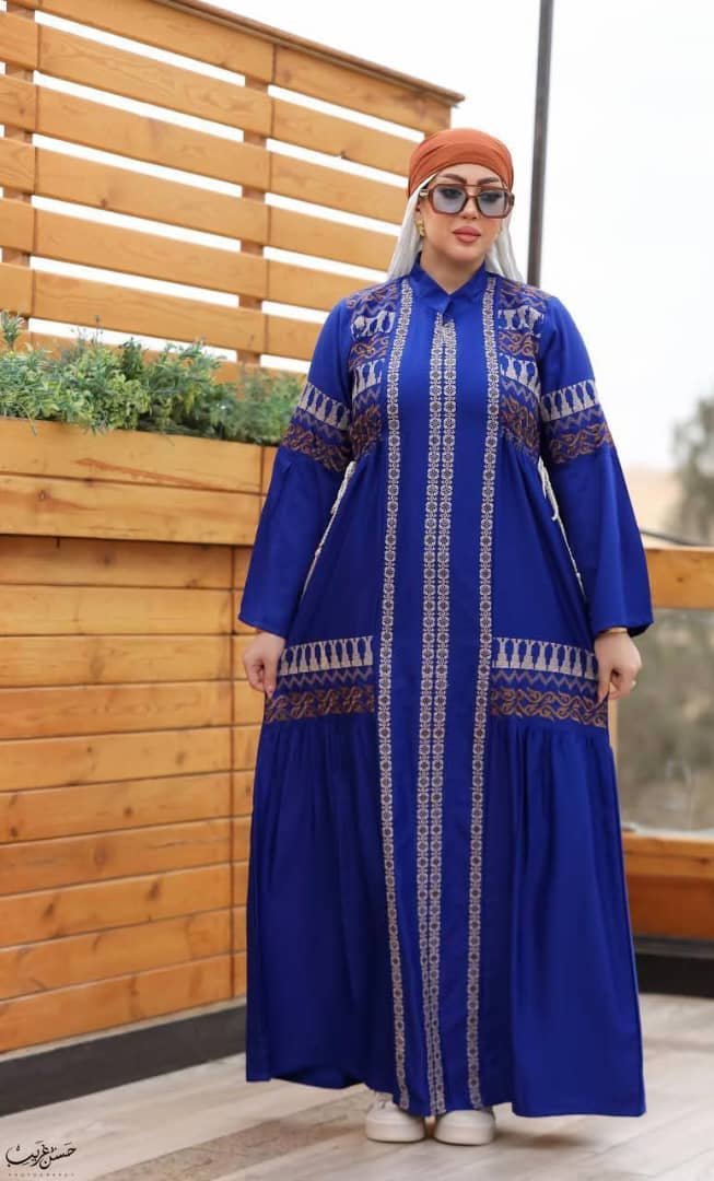 جلابية نسائية طويلة باللون الأزرق الملكي، مزينة بتطريزات ذهبية أنيقة على الصدر والأكمام والواجهة الأمامية، لتمنح إطلالة محتشمة وفخمة تناسب المناسبات والاستقبالات والزيارات الراقية.