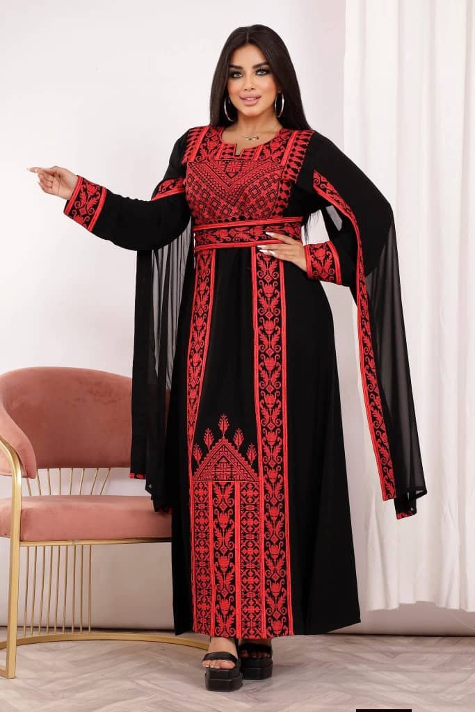 جلابية نسائية سوداء بتطريز أحمر تراثي فاخر