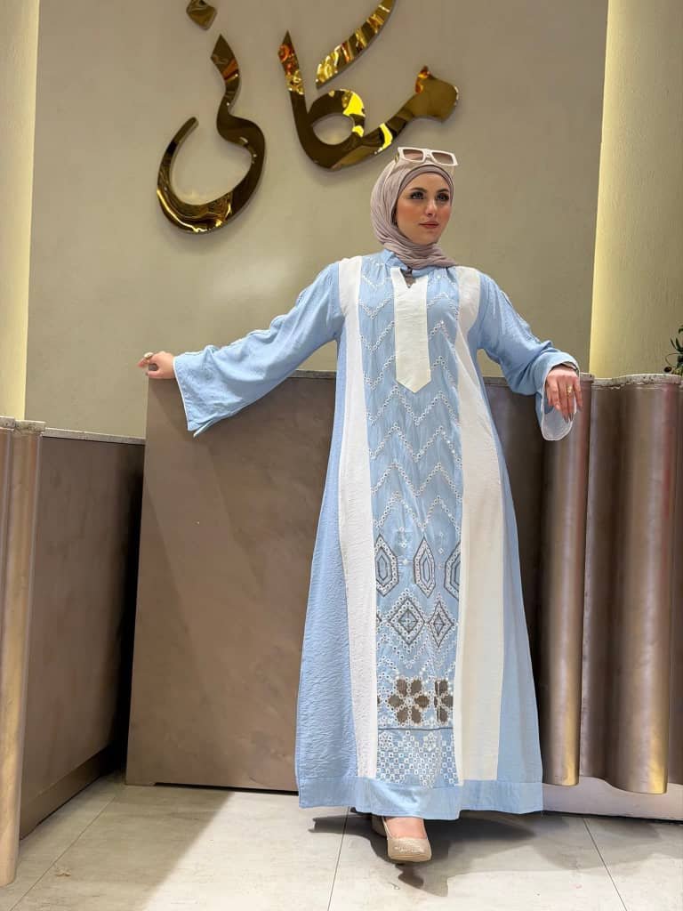 جلابية نسائية أنيقة بتصميم طويل وانسيابي يجمع بين الطابع التراثي واللمسة العصرية في قطعة واحدة راقية. تأتي بدرجات سماوية هادئة مع تفاصيل بيضاء جانبية تضيف توازنًا جميلًا على التصميم، بينما تزين الواجهة الأمامية نقوش هندسية وتطريزات ناعمة تمنح الجلابية طابعًا مميزًا وحضورًا أنيقًا. كما أن الأكمام الواسعة نسبيًا والقصة المريحة تضيفان إحساسًا بالراحة والعملية مع الحفاظ على المظهر المحتشم والمرتب.