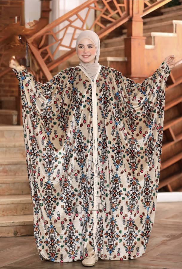 جلابية نسائية راقية بتصميم واسع ومريح يجمع بين الطابع التراثي واللمسة العصرية في قطعة واحدة مميزة. تأتي بلون أوف وايت هادئ يبرز جمال النقوش الملونة الموزعة على كامل التصميم، حيث تضيف الزخارف المستوحاة من الطابع الشعبي والتراثي حضورًا أنيقًا ومختلفًا. كما أن القصة الفضفاضة والأكمام الواسعة جدًا تمنح راحة كبيرة أثناء الحركة وتضفي مظهرًا محتشمًا وفخمًا في الوقت نفسه.