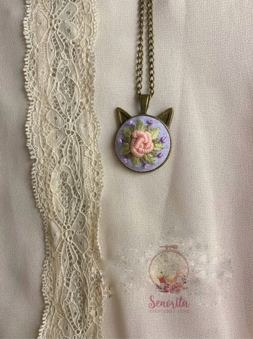 سلسال بإطار قطة مع قاعدة قماش باللون الموف وتطريز وردة باللون الوردي الفاتح.