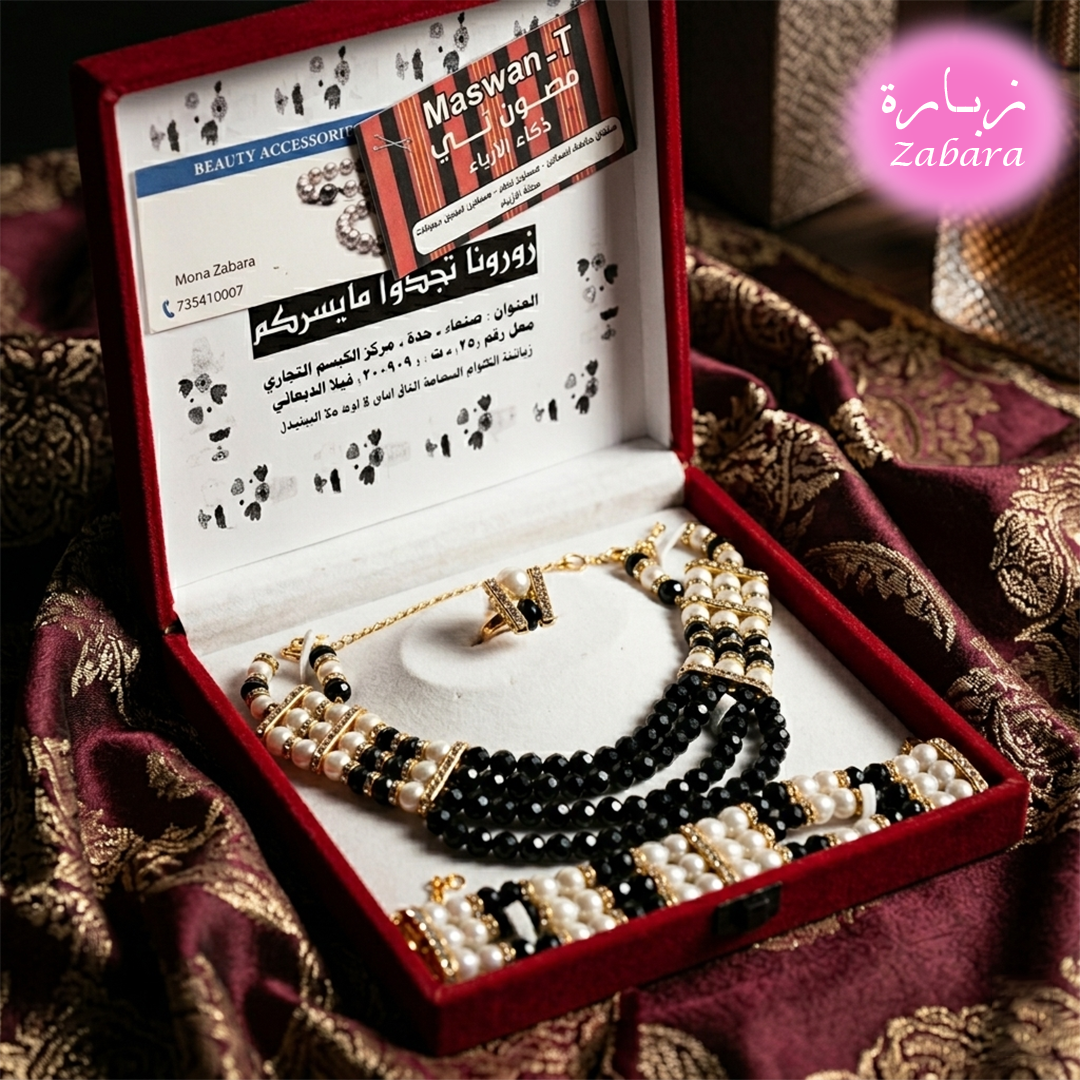طقم نسائي أنيق بتصميم فاخر يجمع بين الخرز الأسود واللؤلؤ الأبيض مع تفاصيل ذهبية راقية، يمنح الإطلالة لمسة فخامة وجاذبية تناسب المناسبات والسهرات والإطلالات المميزة.