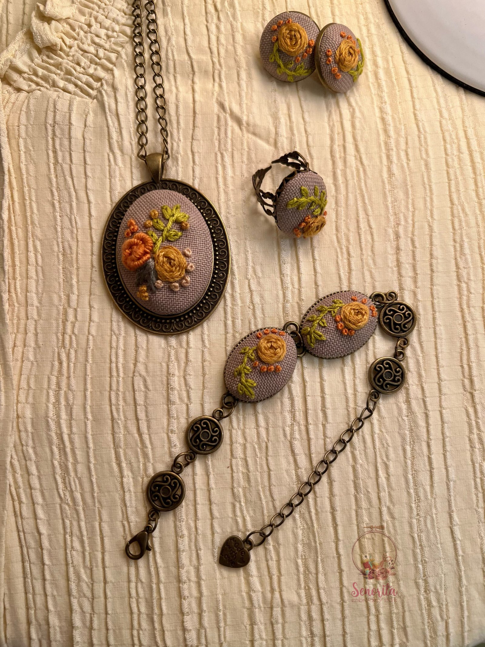 تطريز طقم اكسسوار مكون من سلسال,خاتم، اسوارة، وحلق. بقاعدة قماش باللون البني الفاتح وورد بألوان النود يناسب اغلب الملابس.