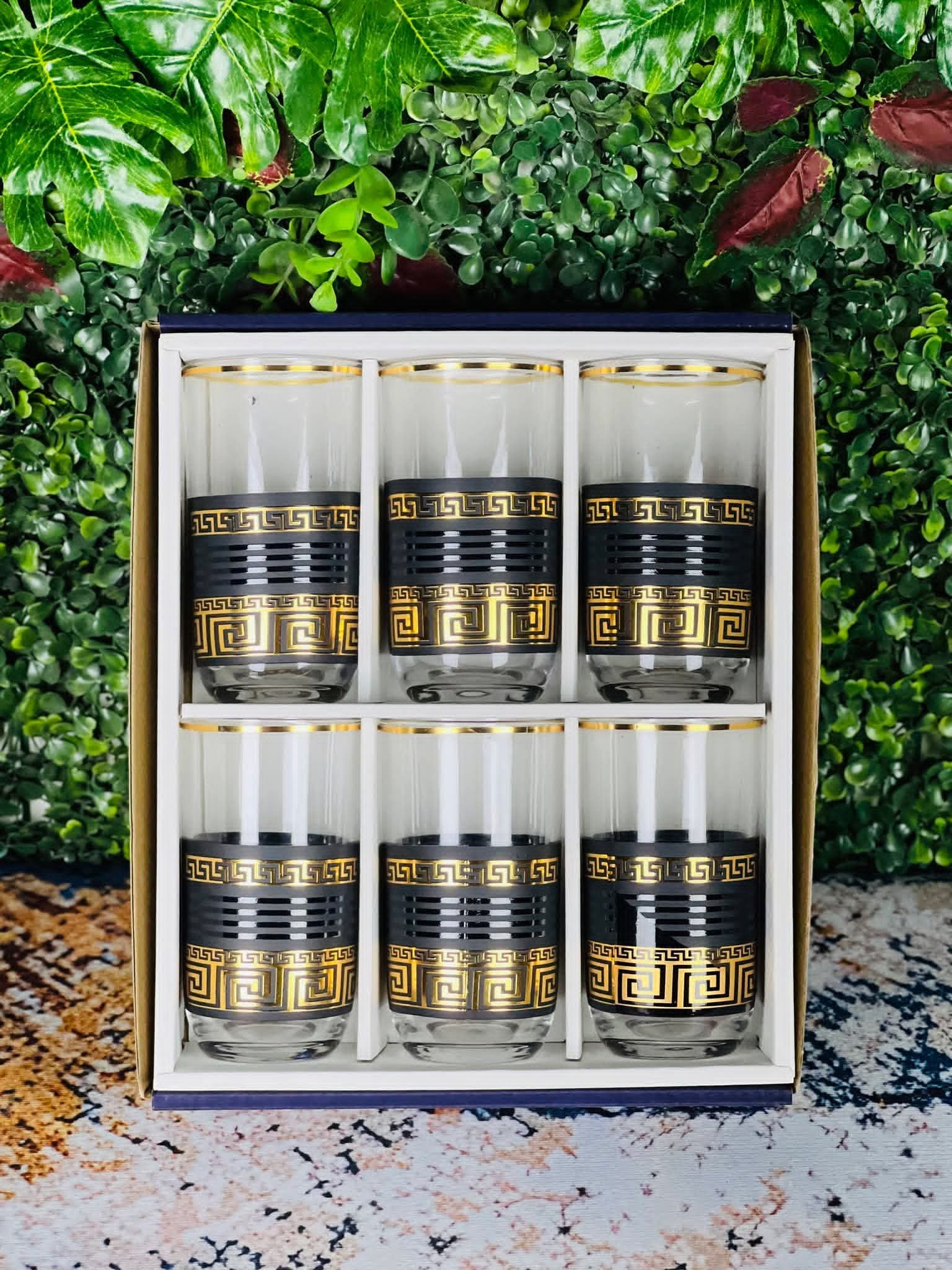 التصميم: يتميز الطقم بنقوش هندسية ذهبية (رسمة فرزاتشي) على خلفية سوداء عريضة تغطي منتصف الكأس، مع حواف مذهبة من الأعلى.الخامة: مصنوعة من الزجاج الشفاف (بلور) مع زخارف من النحاس أو مواد مطلية باللونين الأسود والذهبي.الاستخدام: تُستخدم لتقديم الماء، العصير، أو المشروبات الباردة، وتعتبر قطعة ديكور أنيقة للضيافة