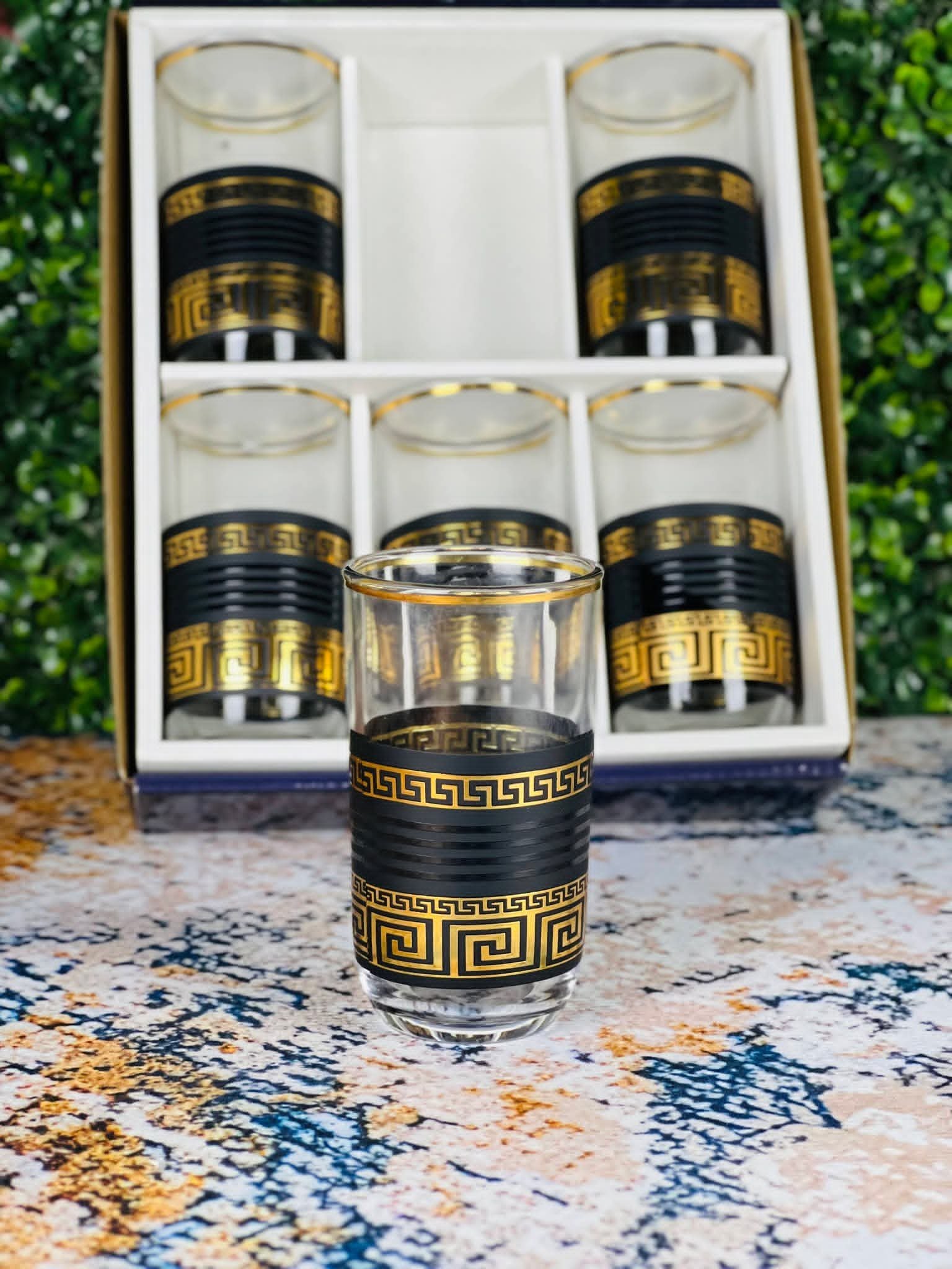طقم كاسات ماء زجاجية بتصميم فرزاتشي، يتميز بزخارف ذهبية وحواف سوداء، وغالبًا ما يستخدم لتقديم المشروبات بأسلوب أنيق