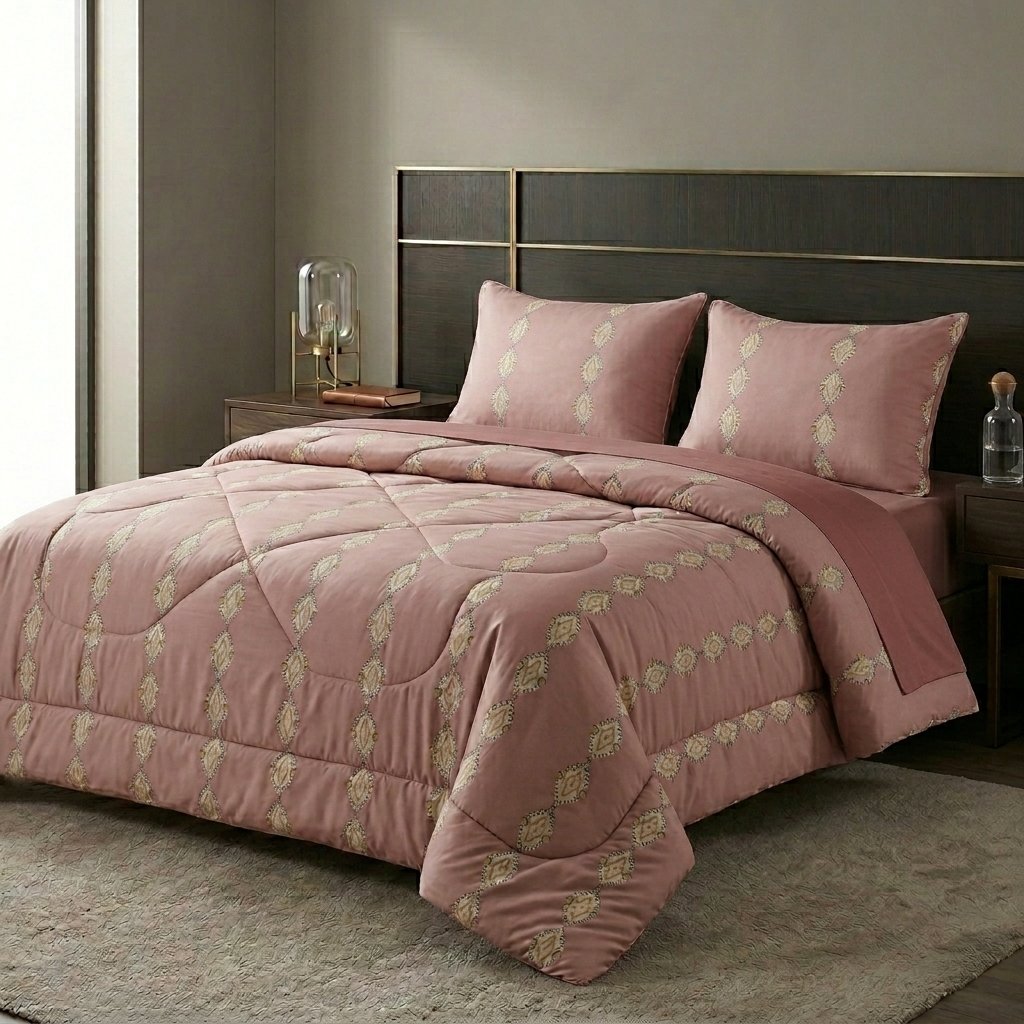 طقم لحاف “الفطاني” المودرن – أناقة اللون الوردي الترابي بنقوش هندسية ناعمة