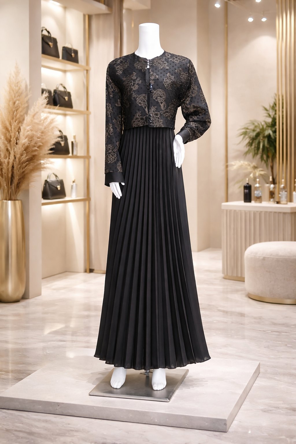 عبايه أسود أنيق يجمع بين الفخامة والبساطة، بتفاصيل نقشات راقية في الجزء العلوي وتنورة واسعة بانسيابية ناعمة، ليمنح إطلالة عصرية راقية تناسب الذوق الهادئ والمميز.
