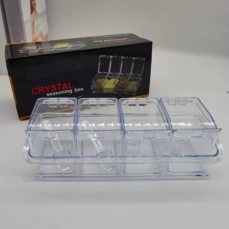 علب بهارات كريستال شفافة (4 قطع) ✨ مع ملاعق وصينية تنظيم، تصميم أنيق يحافظ على بهارات ويرتب مطبخك بشكل جميل وسهل الاستخدام.