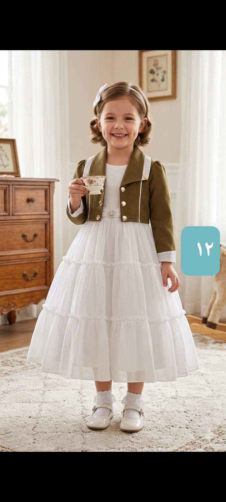 طقم بناتي راقٍ يتكون من فستان أبيض طويل بطبقات ناعمة مع جاكيت قصير باللون الزيتي مزين بأزرار ذهبية، ليمنح الطفلة إطلالة أنيقة ومميزة للمناسبات والزيارات.