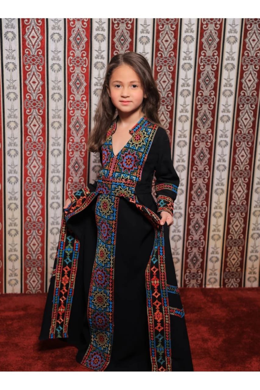 فستان بناتي تراثي بتصميم راقٍ يجمع بين الأصالة والأناقة في قطعة واحدة مميزة. يأتي باللون الأسود الكلاسيكي الذي يبرز جمال التطريزات الملونة الممتدة على الصدر والأكمام والحواف الأمامية، ما يمنح الفستان حضورًا قويًا وطابعًا تراثيًا واضحًا. النقوش الهندسية الغنية بالألوان تضيف لمسة فنية جميلة تعكس الذوق التقليدي بأسلوب أنيق يناسب البنات في مختلف المناسبات.