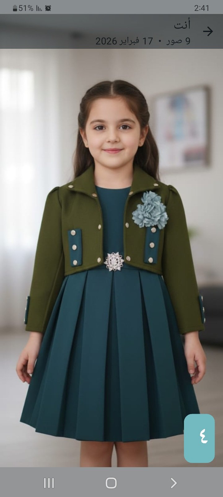 طقم بناتي أنيق يتكون من فستان باللون التركواز بتصميم بكسرات مرتبة مع جاكيت قصير باللون الزيتي مزين بتفاصيل متناسقة ووردة جانبية ناعمة، ليمنح الطفلة إطلالة راقية ومميزة للمناسبات.