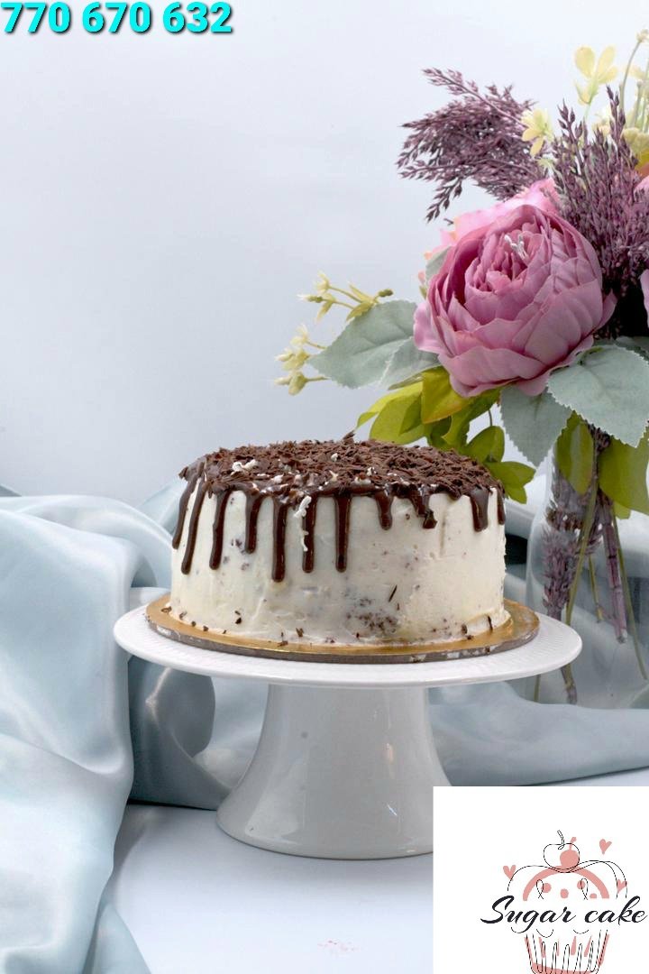 كيكة مميزة بتصميم أنيق يجمع بين البساطة والفخامة في شكل تقديم راقٍ وجذاب. تتميز بطبقة كريمة بيضاء ناعمة تغطي الكيكة بالكامل، مع صوص شوكولاتة منساب على الأطراف يمنحها مظهرًا شهيًا واحترافيًا، إضافة إلى مبشور الشوكولاتة على الوجه الذي يضيف لمسة غنية وجذابة في الطعم والشكل.