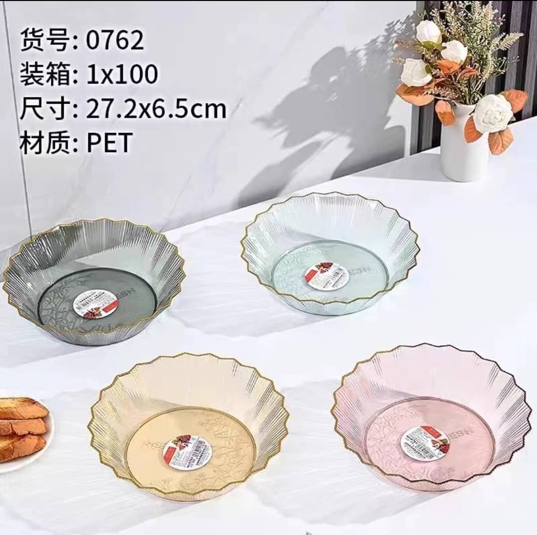 مجموعة من أطباق تقديم الفواكه والوجبات الخفيفة ذات تصميم عصري وأنيق، وتتميز بحواف متموجة بلمسة ذهبية. هذه الأطباق متعددة الاستخدامات، حيث يمكن استخدامها لتقديم المكسرات، السلطات، الحلويات، أو كقطع ديكور منزلية.
