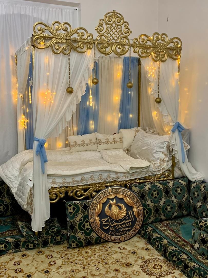 كوشة ديكورية فاخرة بتصميم ذهبي مزخرف مع ستائر بيضاء وسماوية وإضاءة دافئة على شكل نجوم، تمنح المكان لمسة ملكية ناعمة تناسب المناسبات المنزلية والاستقبالات وجلسات التصوير.