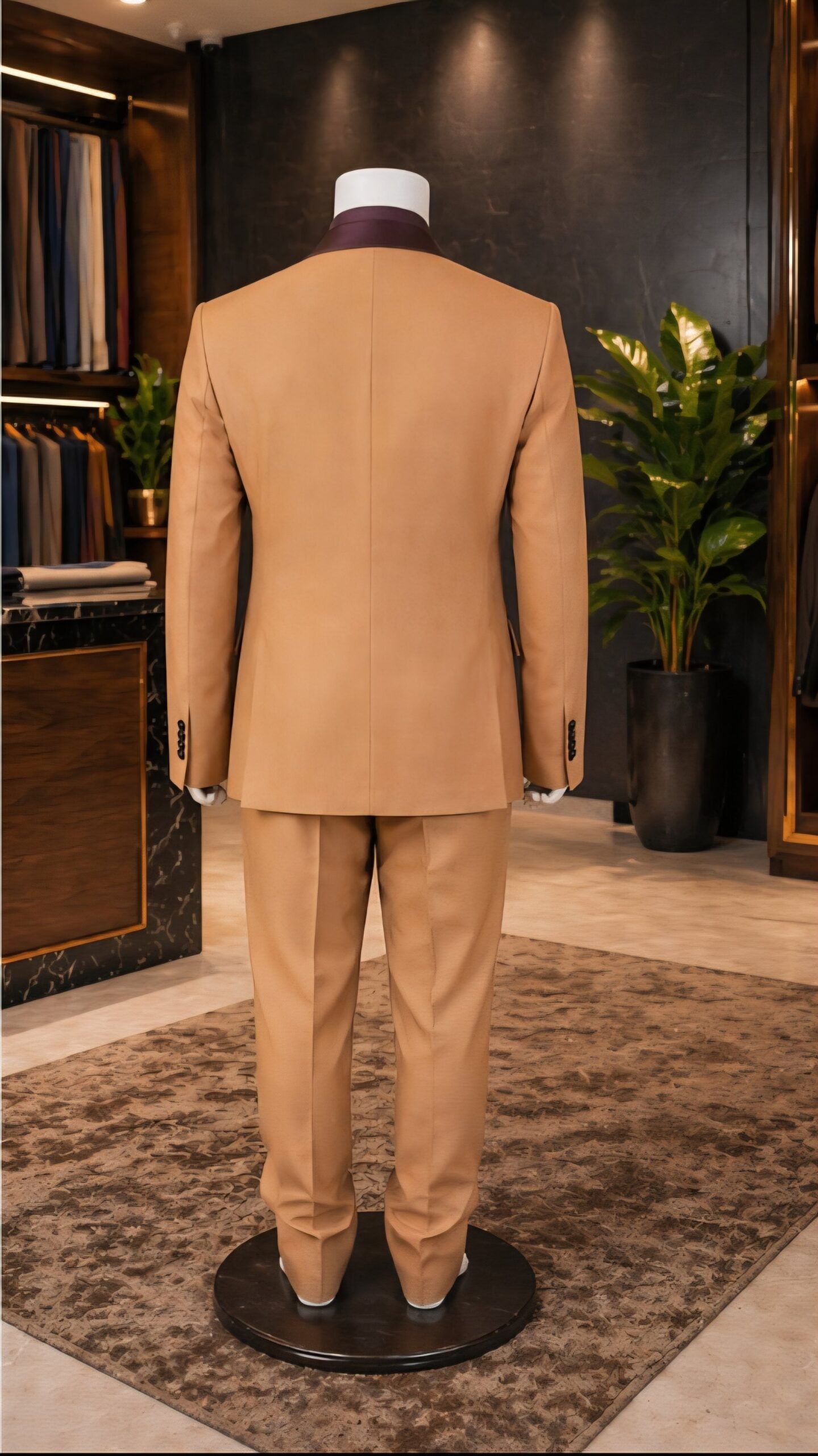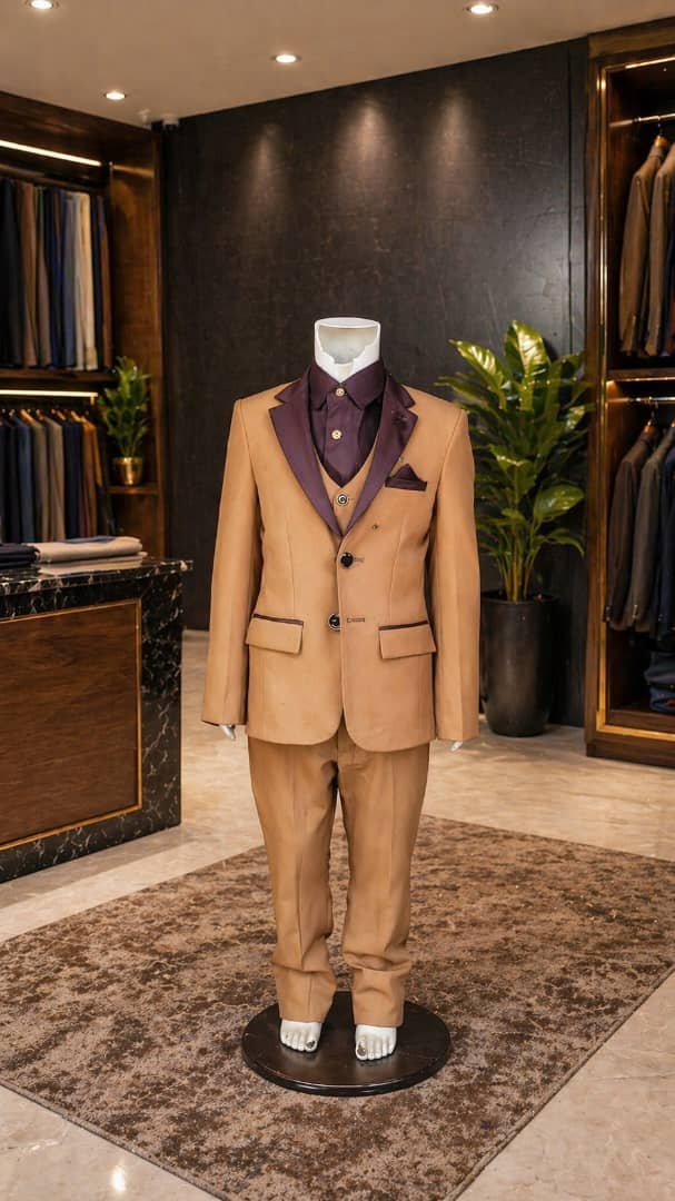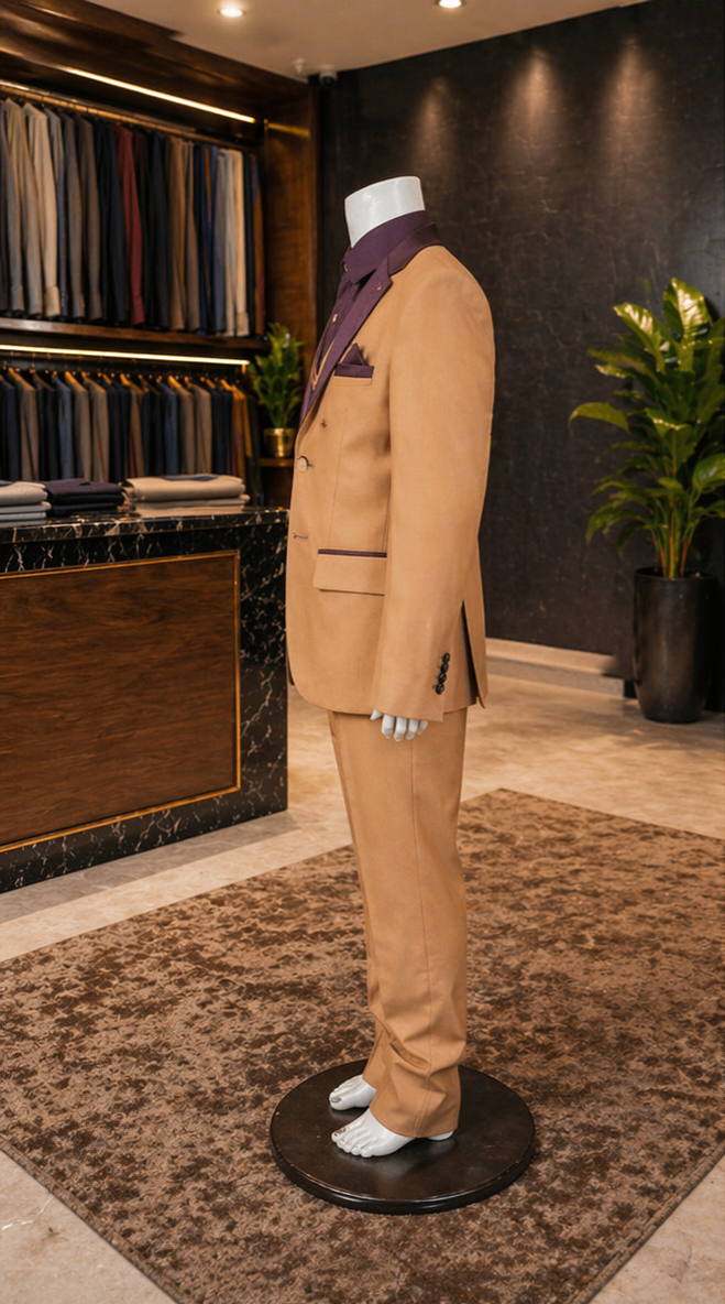 بدلة رجالية أنيقة بلون بيج دافئ مع ياقة بتفاصيل داكنة وقميص داخلي بلون خمري، تمنح إطلالة فاخرة وعصرية تناسب المناسبات الراقية.