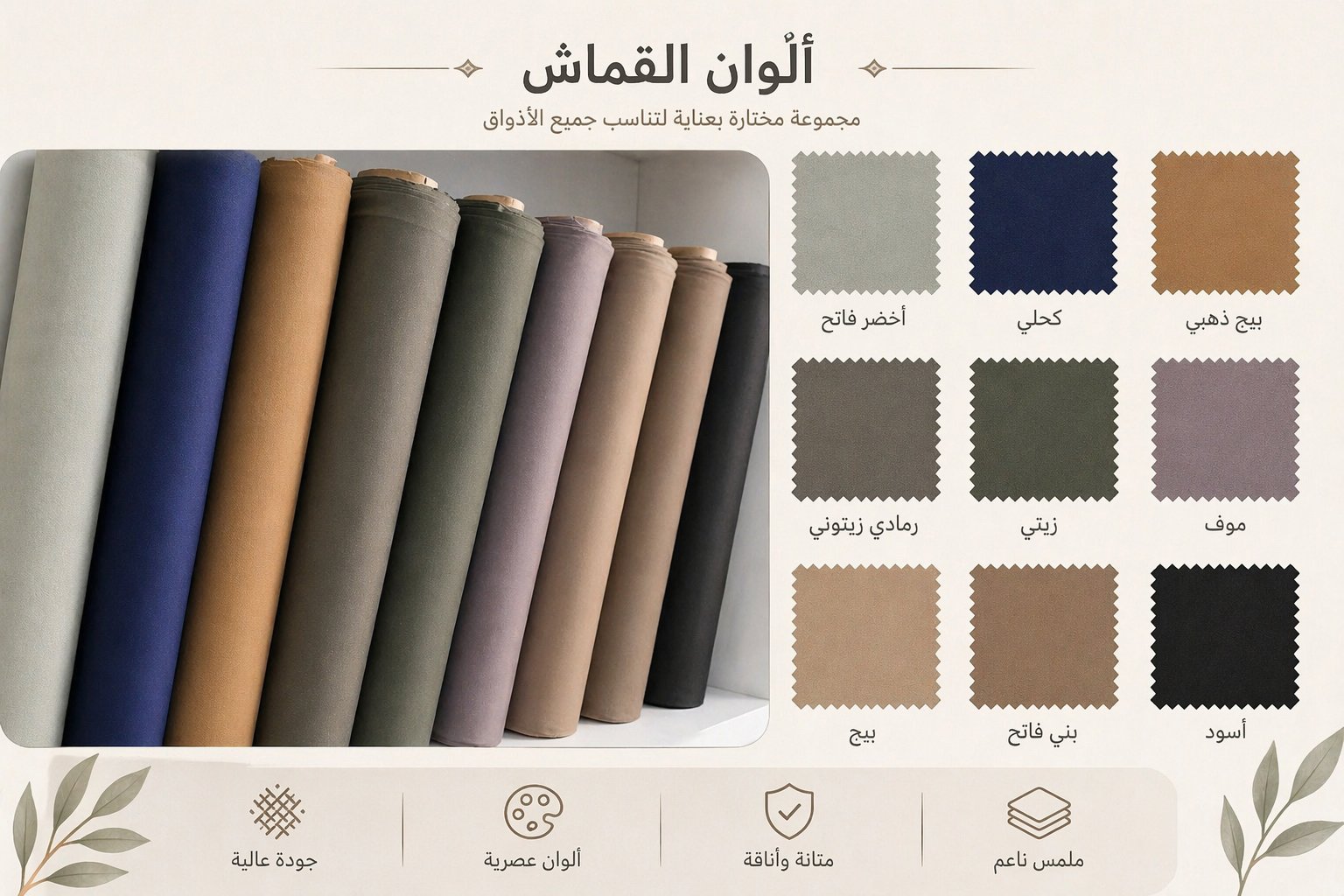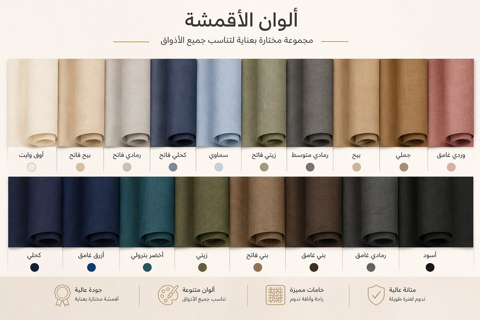 تُقدّم هذه التشكيلة المميزة من ألوان الأقمشة تنوعًا غنيًا يجمع بين الكلاسيكية والعصرية، حيث تضم درجات هادئة مثل الأوف وايت والبيج والرمادي، إلى جانب ألوان أكثر عمقًا كالكحلي والبني والأسود. كما تشمل لمسات لونية جذابة مثل السماوي والزيتـي والأخضر البترولي والوردي الغامق، مما يتيح خيارات واسعة تناسب مختلف المناسبات والأذواق.