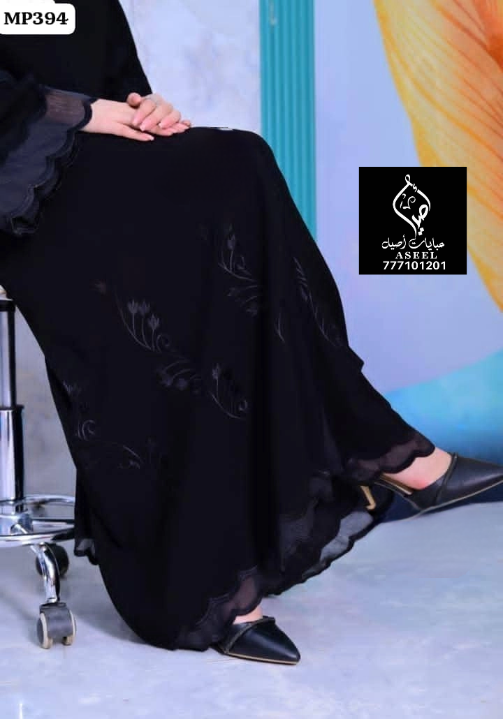 لمسات احترافية: أطراف العباية السفلية مصممة بشكل “مموج” (Scalloped edges) مع طبقة شفافة تزيد من رقي التصميم.