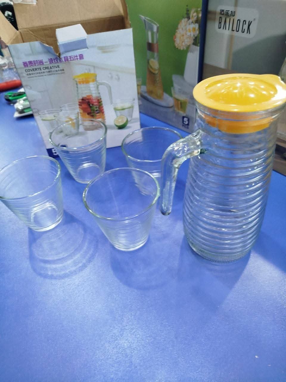 طقم جاك زجاجي مع 4 قلاصات بتصميم أنيق، مثالي لتقديم العصائر والمشروبات بطريقة راقية ومنظمة 🍹✨