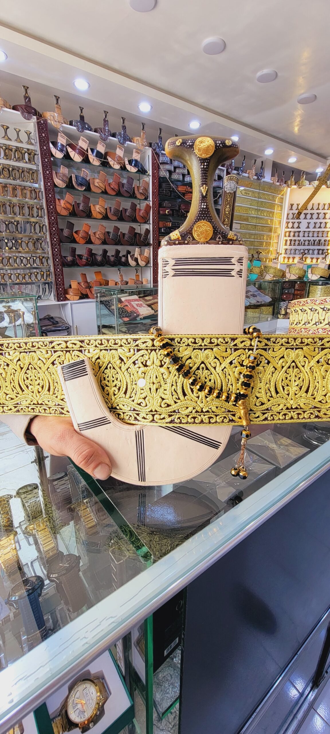 حزام درجه اولئ مع عسيب ابيض عشر. مع جنبيه. مقلد الصيفاني. رقم 1. مع شبريه. قرن. وغلاف شبريه جلد. مع ادوات الحزام والتركيب