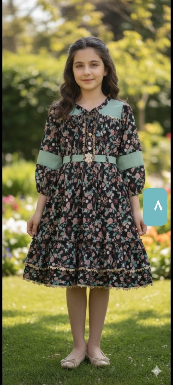 فستان بناتي راقٍ بتصميم أنثوي جميل يجمع بين الطابع الكلاسيكي واللمسة العصرية في آن واحد. يتميز بقماش مزهر بطبعات ورود ناعمة على خلفية داكنة تمنحه مظهرًا أنيقًا ومرتبًا، مع تفاصيل بلون المينت عند الياقة وحواف الأكمام والحزام تضيف تباينًا جذابًا ولمسة منعشة على التصميم. كما تأتي الأزرار الأمامية والزخرفة الوسطية لتزيد من أناقة الفستان وتمنحه حضورًا مميزًا.