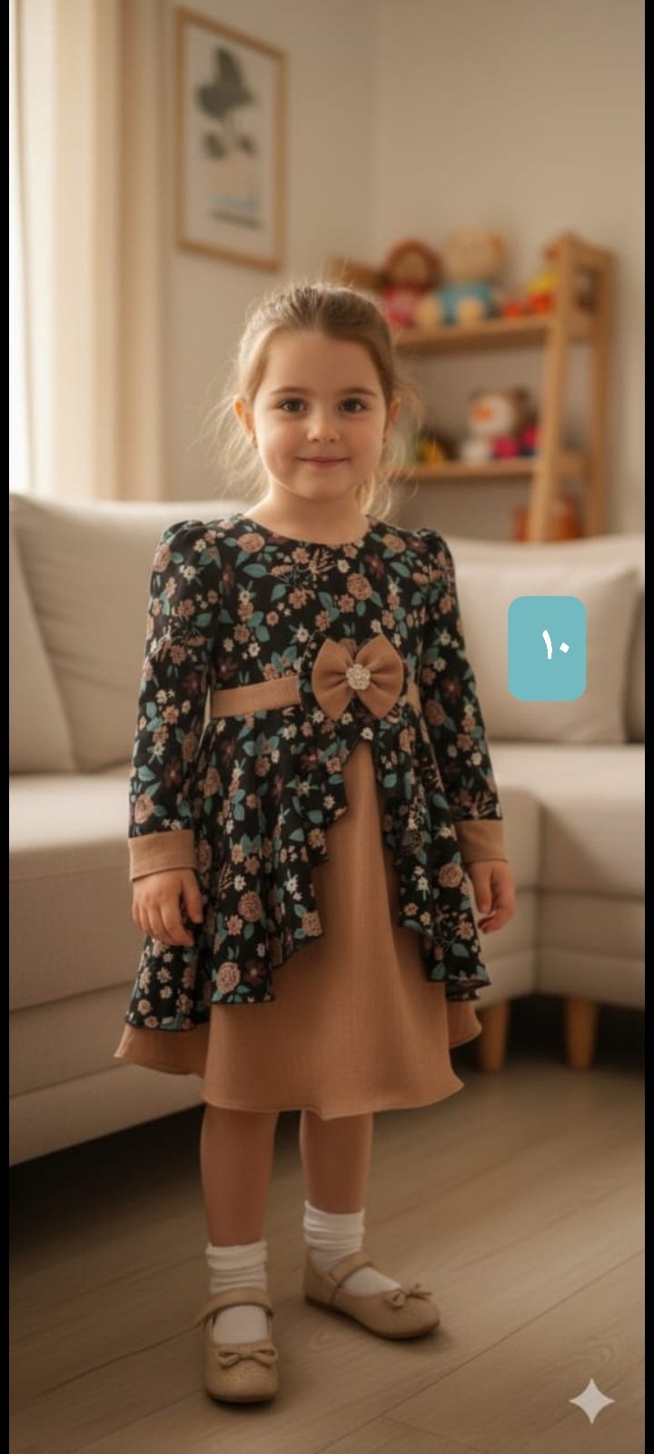 فستان بناتي راقٍ بتصميم أنثوي جميل يناسب الإطلالات المرتبة والمناسبات المختلفة. يتميز بقماش أسود مزين بطبعات زهور ناعمة تضيف لمسة حيوية وأنيقة، مع تنسيق داخلي باللون البيج يمنح الفستان تباينًا جذابًا ومظهرًا مميزًا. كما تأتي فيونكة أمامية كبيرة عند الخصر لتزيد من جمال التصميم وتمنحه طابعًا طفوليًا راقيًا.الفستان مزود بأكمام طويلة نسبيًا، ما يجعله مناسبًا للأجواء المعتدلة والباردة، كما أن قصته الواسعة والمتدرجة تمنح راحة أثناء الحركة مع مظهر أنيق ومرتب. هذا التصميم مناسب للزيارات، المناسبات العائلية، الأعياد، حفلات المدرسة، وجلسات التصوير، وهو خيار جميل لمن تبحث عن فستان بناتي يجمع بين النعومة والأناقة ولمسة كلاسيكية محببة.