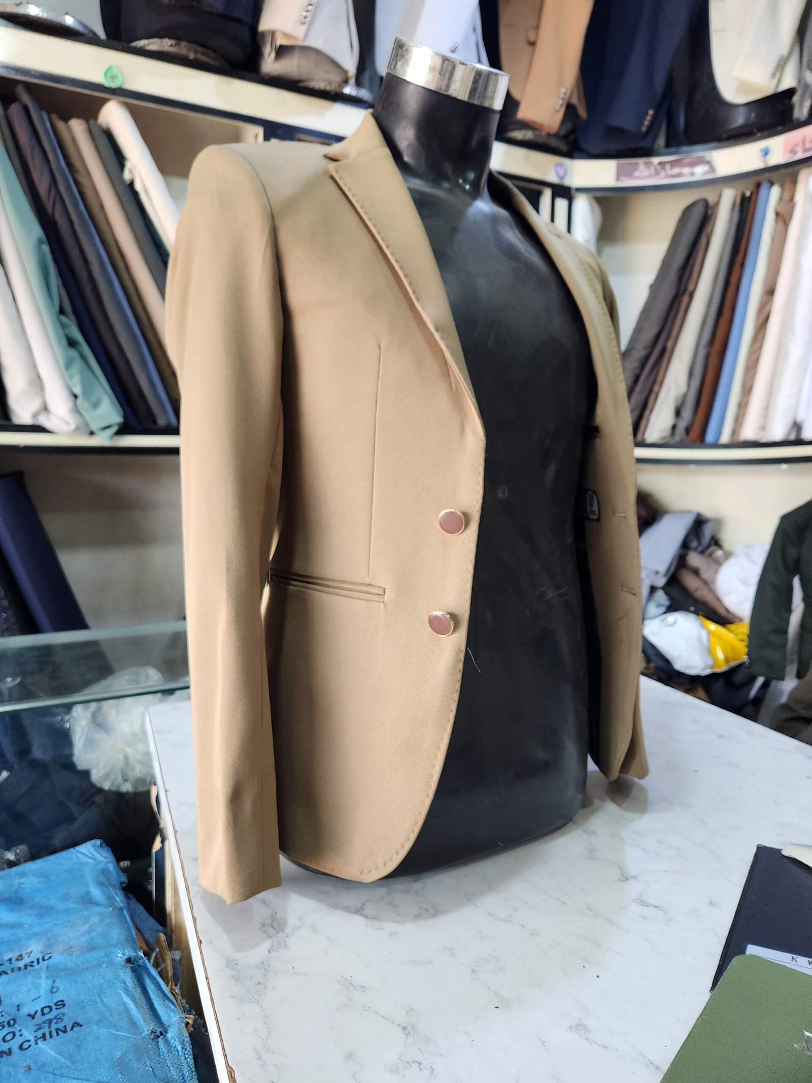 الفخامة اخر مانزل السوق سترة أنيقة بلون بيج فاتح مع أزرار أمامية، معروضة على مجسم داخل محل خياطة تحيط به أقمشة وبدلات جاهزة.