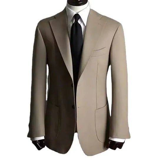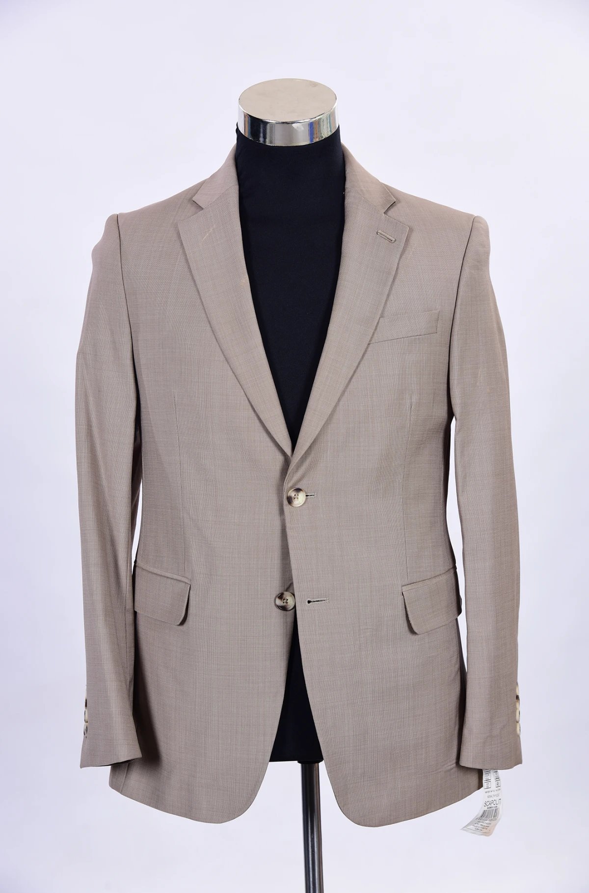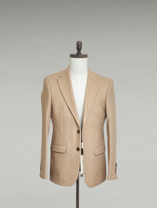 تُظهر الصورة سترة رسمية أنيقة بلون بيج دافئ، معروضة على دمية عرض سوداء داخل محل خياطة أو تفصيل ملابس. التصميم يبدو كلاسيكيًا بلمسة عصرية، حيث تتميز السترة بقصّة ضيقة نسبيًا (Slim Fit) تعطي مظهرًا أنيقًا ومحددًا للجسم.