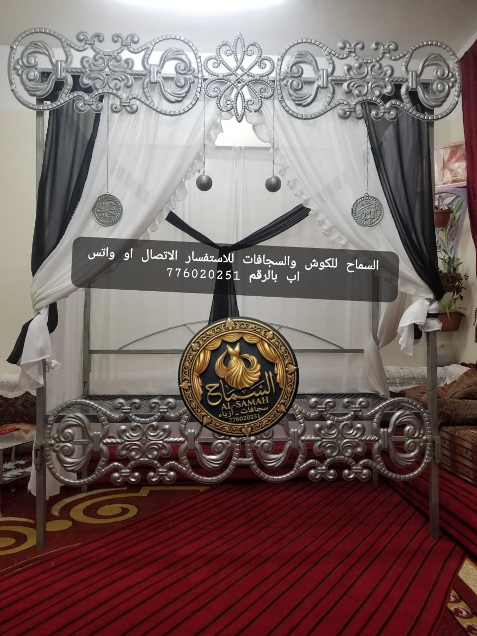 كوشة أنيقة بتصميم فاخر تجمع بين الإطار الفضي المزخرف بالتفاصيل الكلاسيكية الراقية وبين الستائر البيضاء والسوداء المنسدلة بأسلوب جذاب يمنح المكان حضورًا مميزًا وفخمًا. يتميز التصميم العلوي والزخارف الأمامية بطابع ملكي ناعم يضيف لمسة احتفالية واضحة، كما أن تنسيق الألوان بين الفضي والأبيض والأسود يمنحها مظهرًا راقيًا سهل الدمج مع مختلف أنواع الديكور والتنسيقات.